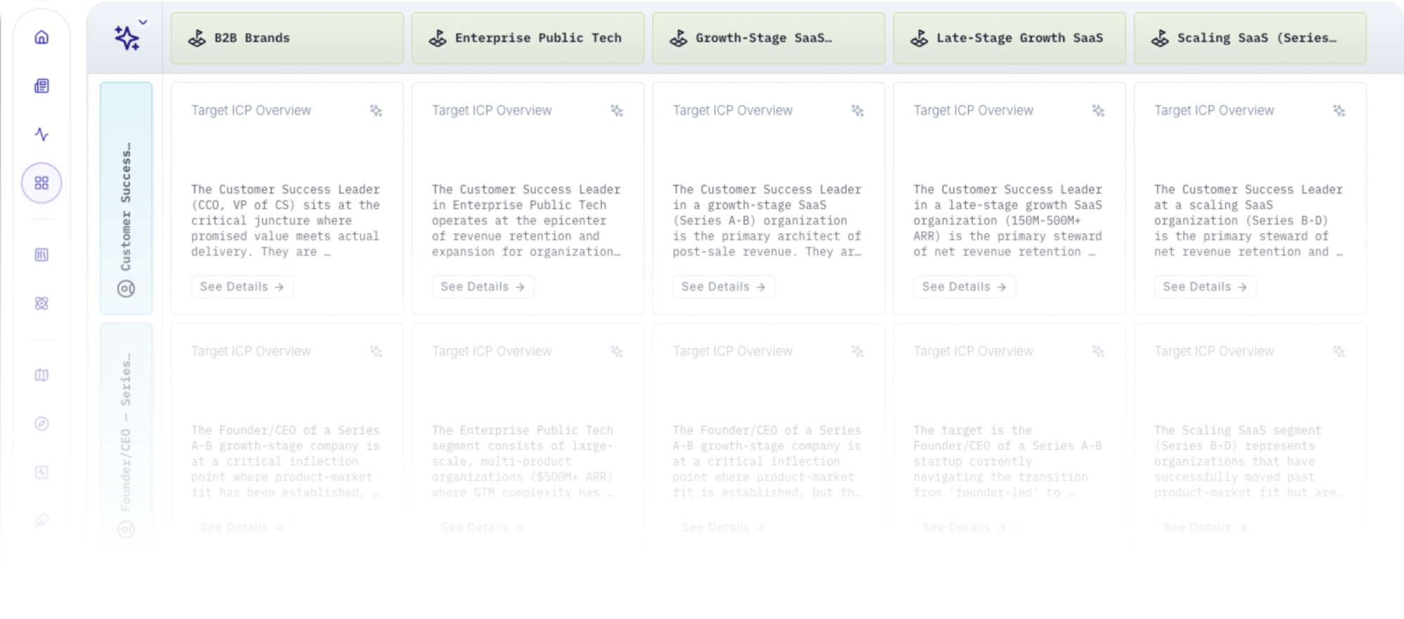 Segments, personas, use cases, pain points, value props, competitive alternatives, proof points, desired outcomes — your ICP is far more than can be captured in filters or prompts. Octave gives you the depth you need to execute with precision and make your GTM your moat.